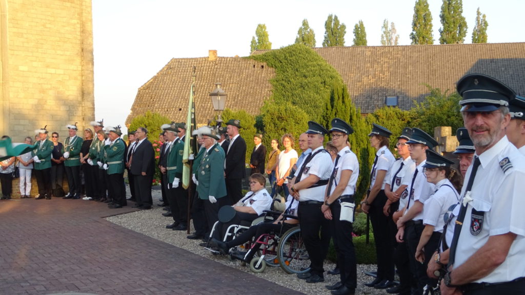 Nach der Heiligen Messe wurde bei der Kranzniederlegung am Mahnmal den Opfern der beiden Weltkriege gedacht. Ein Trompetensolo, gespielt von Marcus und Hubert Rheinen, und das Schwenken der Fahnen bildeten einen würdevollen Rahmen.